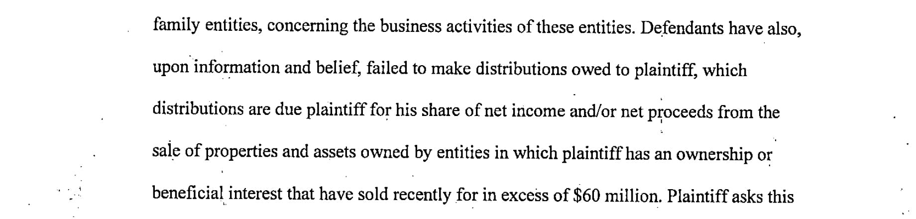 GET THE LATEST BREAKING NEWS HERE -- SIGN UP FOR GOLOCAL FREE DAILY EBLAST“The sale and/or value of the properties and assets identified … have generated approximately $60 million revenue. Timothy, however, has not received distributions and/or proceeds from the sale of these properties and/or assets due and owing to him pursuant to his ownership and/or beneficial interest in these entities,” according to the lawsuit.