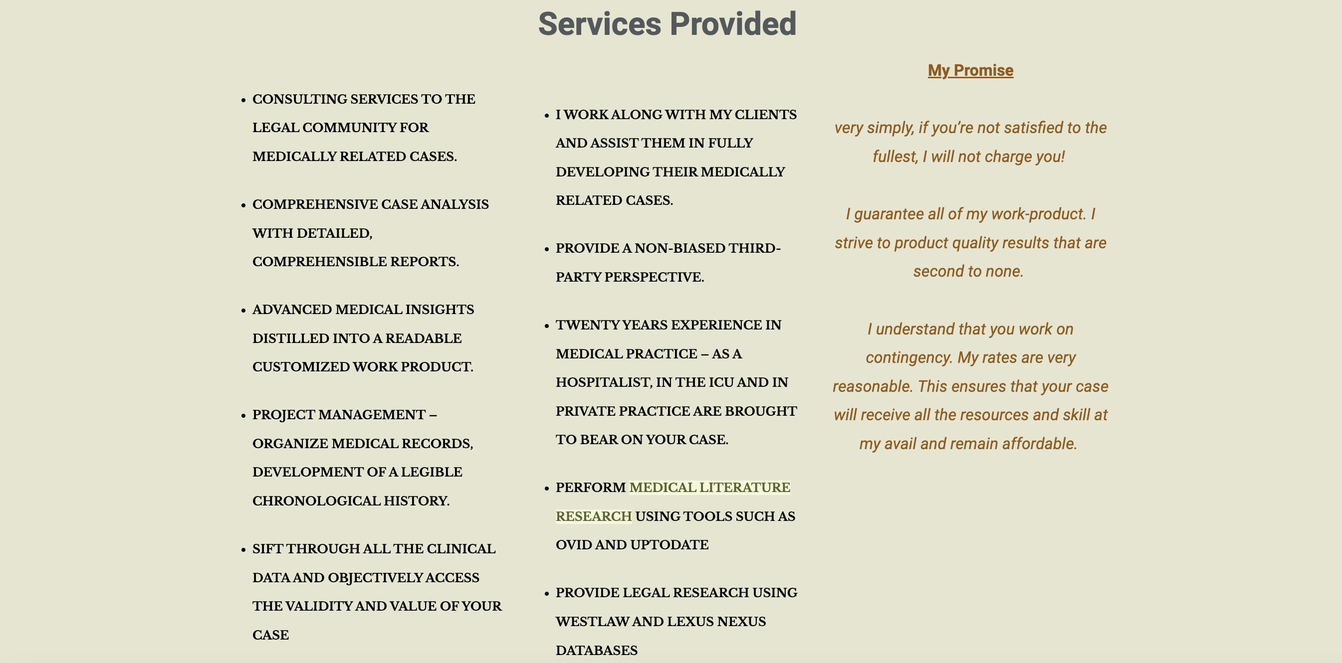 According to his bio, he provides “medical-legal consulting for personal injury and medical malpractice who require the assistance of a medical doctor with legal training" and much more, according to his business’ website.
