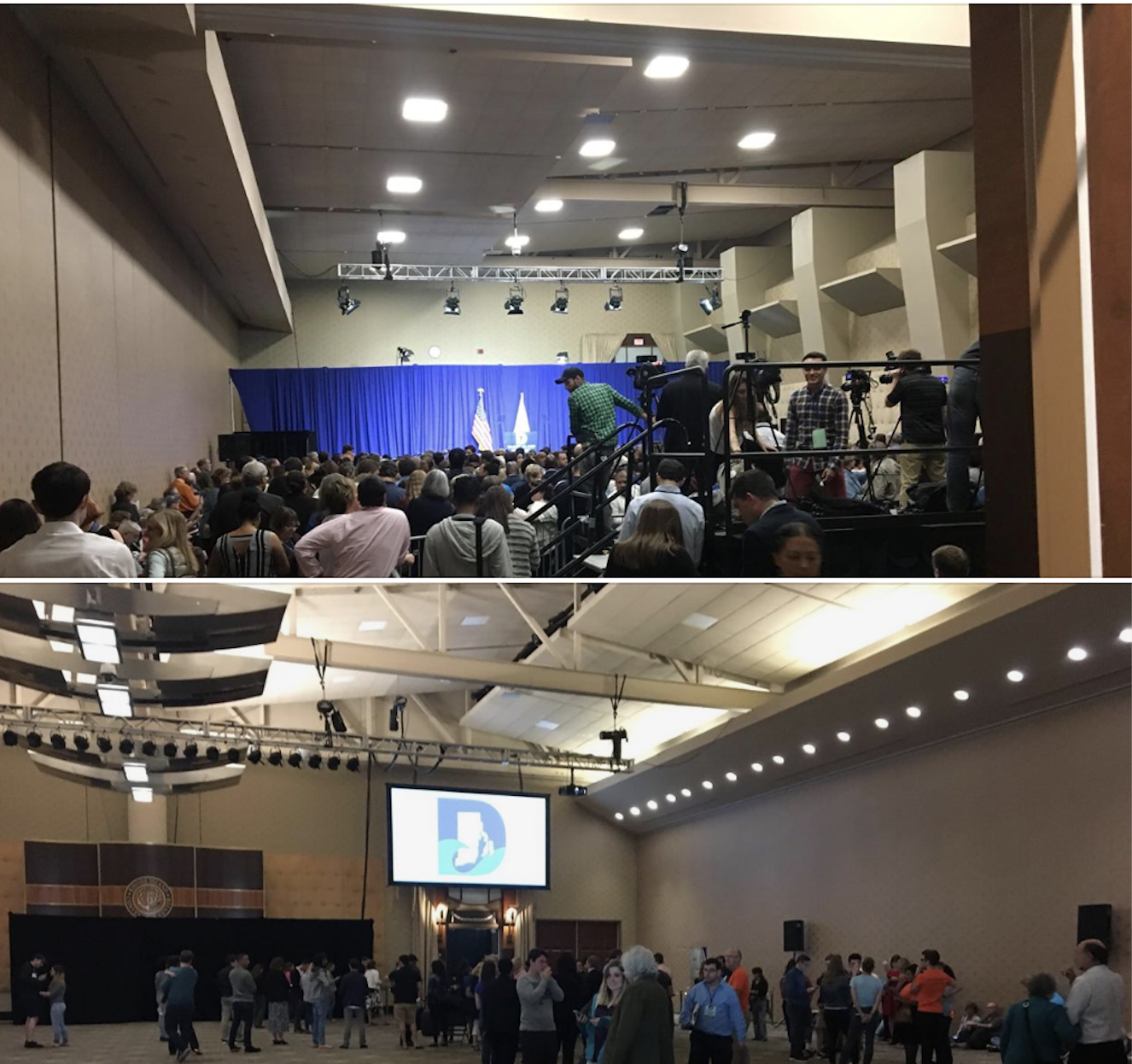 "We signed up for the Biden event at the Providence Convention Center. Paid $15 for parking. Got here early only to find the in crowd in a tiny walled off room. The rest of us can watch it on a TV screen. This is a bad start," wrote Bruce McIntyre on Facebook.