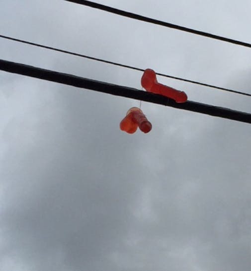 Not only are tossing dildos onto power lines a safety hazard, they could also be considered illegal.