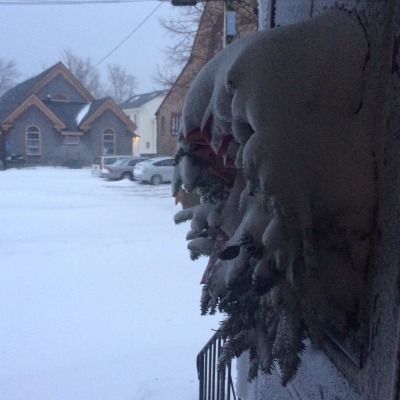 Frozen wreath on a door.