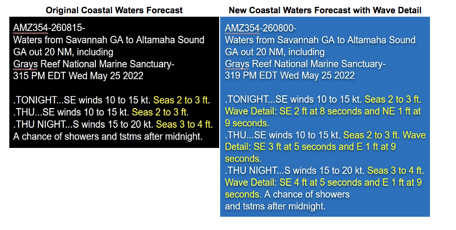 “The NWS, through this experimental product, will now provide wave height, period, and direction in the Coastal Waters Forecast (CWF),” says NWS. “Currently, some Weather Forecast Offices (WFOs) only provide significant wave height, while others only provide wind wave and swell, creating inconsistencies. The Experimental CWF Wave Component Update will enable NWS WFOs to provide enhanced wave information.”