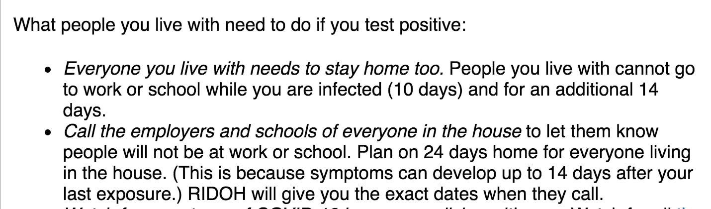 "Call the employers and schools of everyone in the house to let them know people will not be at work or school. Plan on 24 days home for everyone living in the house. (This is because symptoms can develop up to 14 days after your last exposure.) RIDOH will give you the exact dates when they call. Watch for symptoms of COVID-19 in everyone living with you," writes the RIDOH.