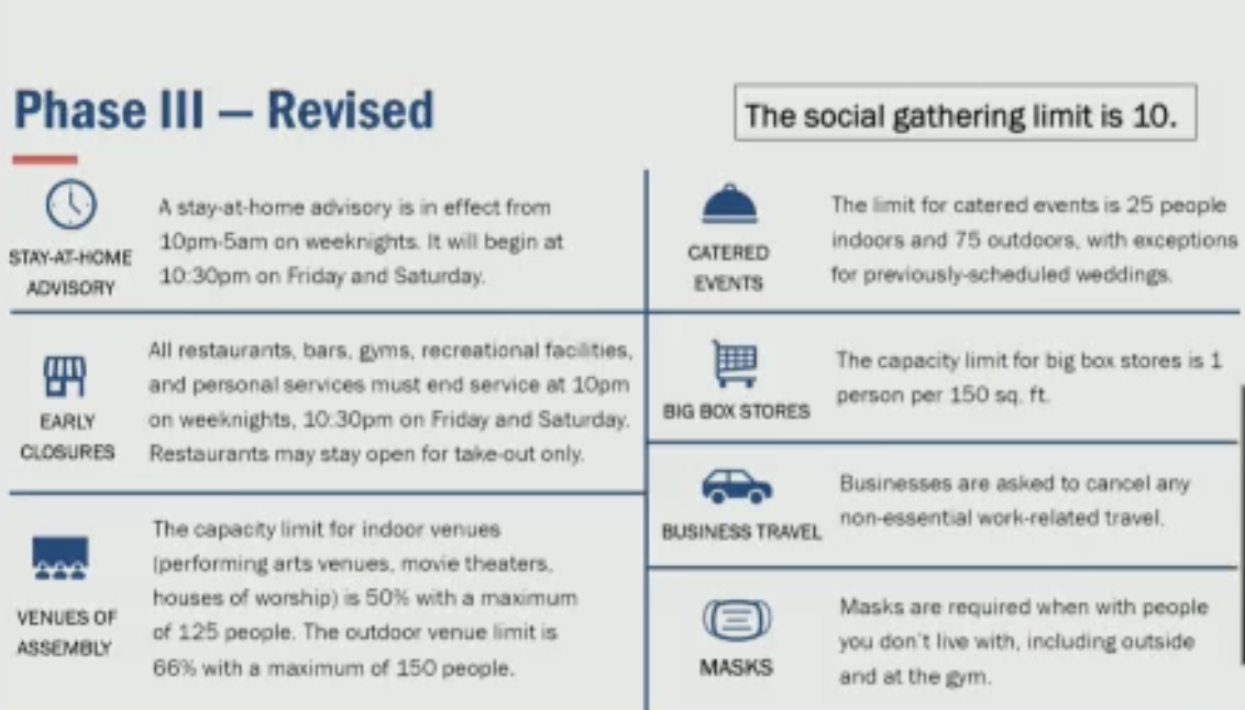 Raimondo issued a stay-at-home advisory between 10 PM and 5 AM, early closures for restaurants and bars, limited capacity numbers for venues of assembly and catered events, and addressed capacity at big box stores and business travel.
