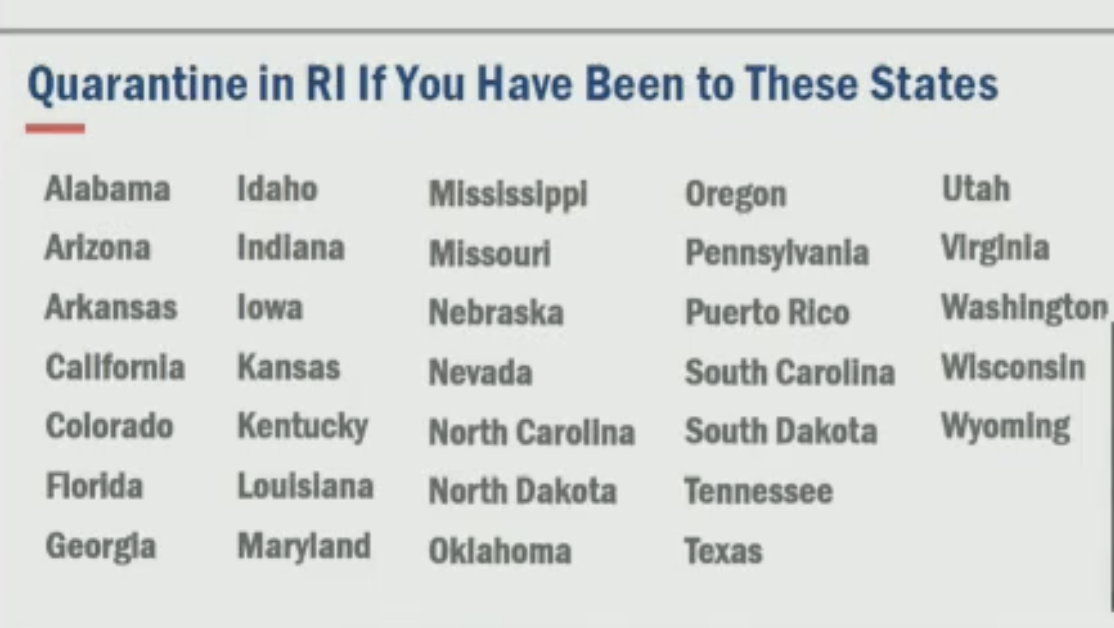 "More than 11% of our cases traced back to out of state travel. We have to get a lot more serious about stopping these cases from coming to Rhode Island," said Raimondo, who showed a map of states, where if residents come to Rhode Island, they have to show a negative test from the prior 72 hours -- or quarantine for 14 days.