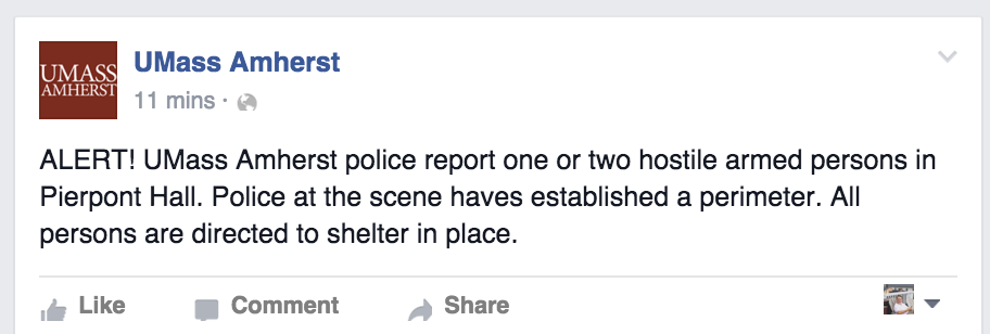 "ALERT! UMass Amherst police report one or two hostile armed persons in Pierpont Hall. Police at the scene haves established a perimeter. All persons are directed to shelter in place."