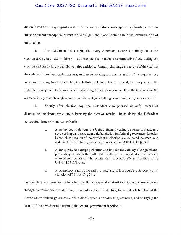 Trump is indicted for four felony crimes, including conspiring to defraud the U.S., obstructing an official proceeding, and conspiring against the rights of voters for his actions that culminated in the Jan. 6, 2021, attack by his supporters on the U.S. Capitol.