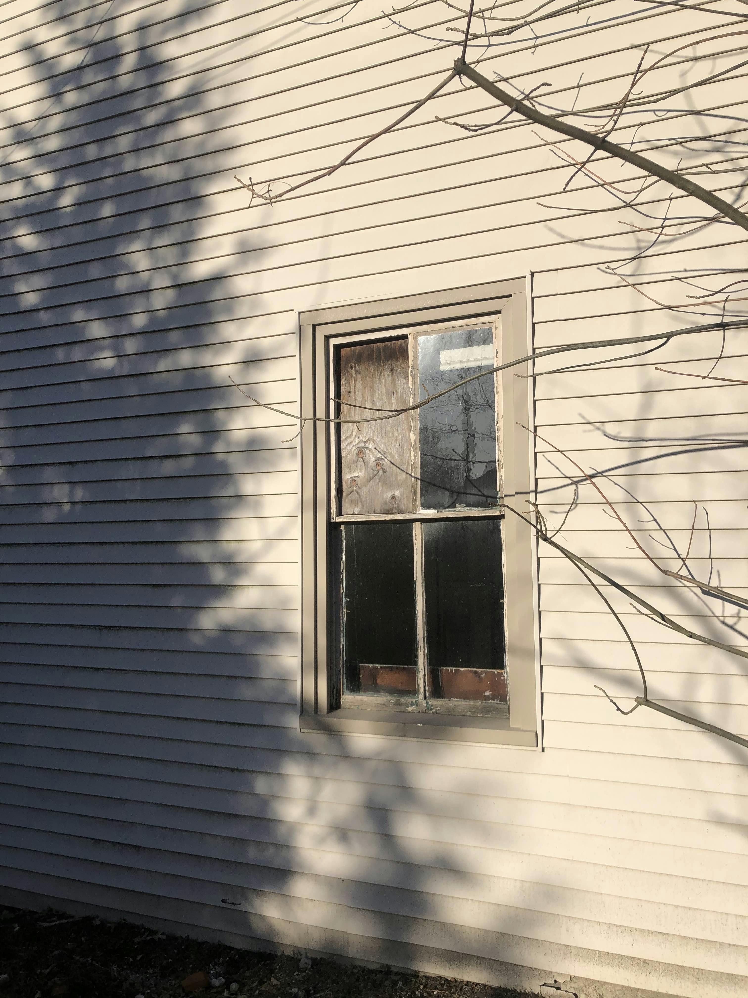 The two houses feature broken windows covered with plywood, peeling paint, and other signs of deterioration.