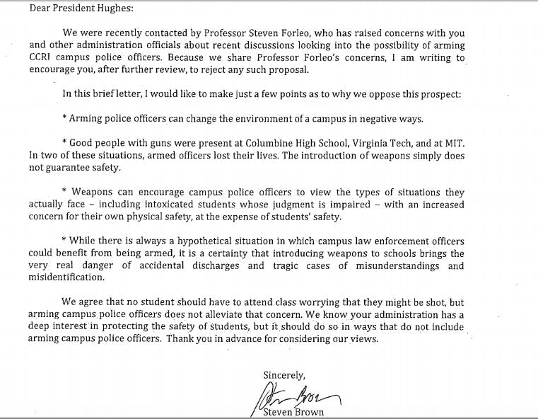 GET THE LATEST BREAKING NEWS HERE -- SIGN UP FOR GOLOCAL FREE DAILY EBLASTA letter sent from RI ACLU Executive Director Steve Brown to President Meghan Hughes, obtained by GoLocalProv, details the civil liberties group's concerns with arming of police at the community college.