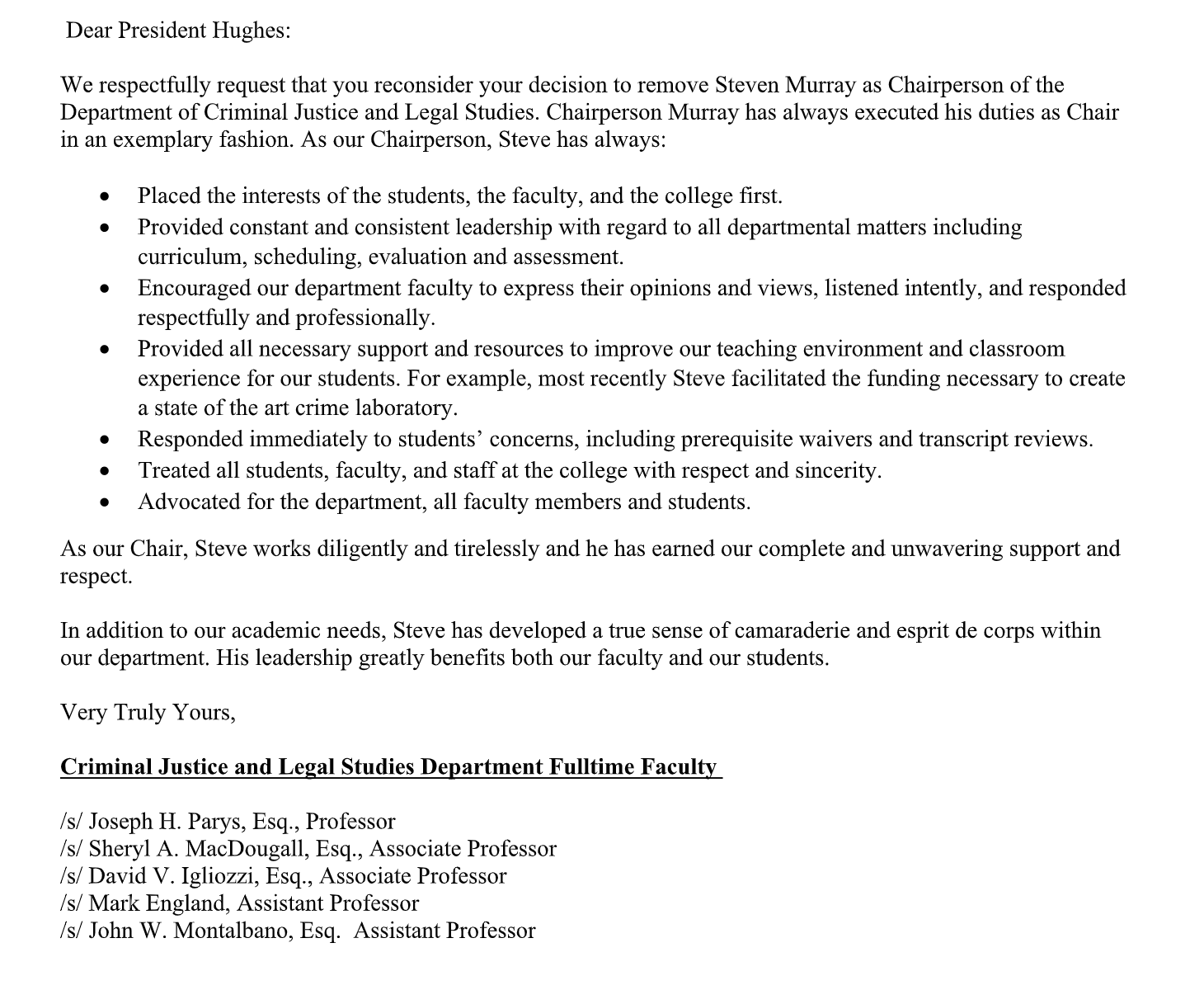 GET THE LATEST BREAKING NEWS HERE -- SIGN UP FOR GOLOCAL FREE DAILY EBLAST“The allegations made by Dean Busby and VP Costigan are baseless and obvious retaliation for my work on behalf of our students, staff and faculty. President Hughes terminated my appointment as Chair, without even giving me the courtesy and opportunity to hear my side of this,” said Murray. “Is that the type of leader we want at our College? One hundred and sixty faculty members have already voted "No Confidence" in her leadership, and her actions here continue to damage her reputation.”