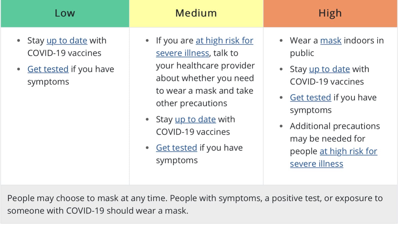 There is a complex set of guidelines for recommended behaviors for both individuals and communities at each of the three new risk levels. Full details are described on the CDC website, with a short summary below: