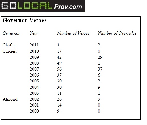 During his eight years in office, Carcieri typically vetoed between 30 and 50 bills a session. Even at his lowest year, his first in office, he issued a veto 11 times. The same goes for Lincoln Almond, who, in his final years in office handed down an average of 16 vetoes a year.