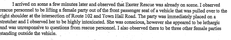 In the report filed by State Trooper Melissa Giardina, the highly intoxicated girl was being placed on a stretcher when she arrived at the scene at the intersection of Route 102 and Town Hall Road. The report indicates that the young woman was seen vomiting before leaving the Chafee home, but that Caleb encouraged the girl’s friends to call 911 after they left the party.