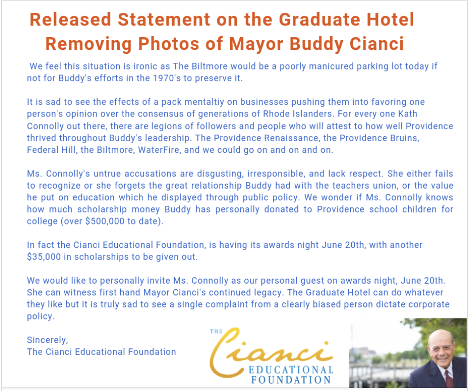 Cianci Foundation Blasts Biltmore “Graduate” Hotel for Removing Portraits of Former Mayor