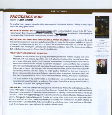 "Anyone who has spent time in Providence, Rhode Island, knows that lurking in the shadows are many sinister noir elements and characters. The city is ripe for this volume, and Akashic is proud to have recruited the amazing Ann Hood as editor," writes Akashic in its site about Providence Noir.