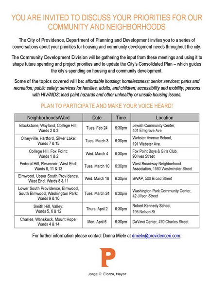 A flyer from the city was posted on Facebook (see below) showing that the East Side neighborhoods Blackstone, Wayland, and College Hill in Wards 2 and 3 were slated for a meeting at the Jewish Community Center on Elmgrove Avenue next Tuesday; however it assigned the East Side neighborhood of Mt. Hope -- which is predominantly in Ward 3 -- to a meeting with Wards 4 and 14 at the DaVinci Center on Charles Street.