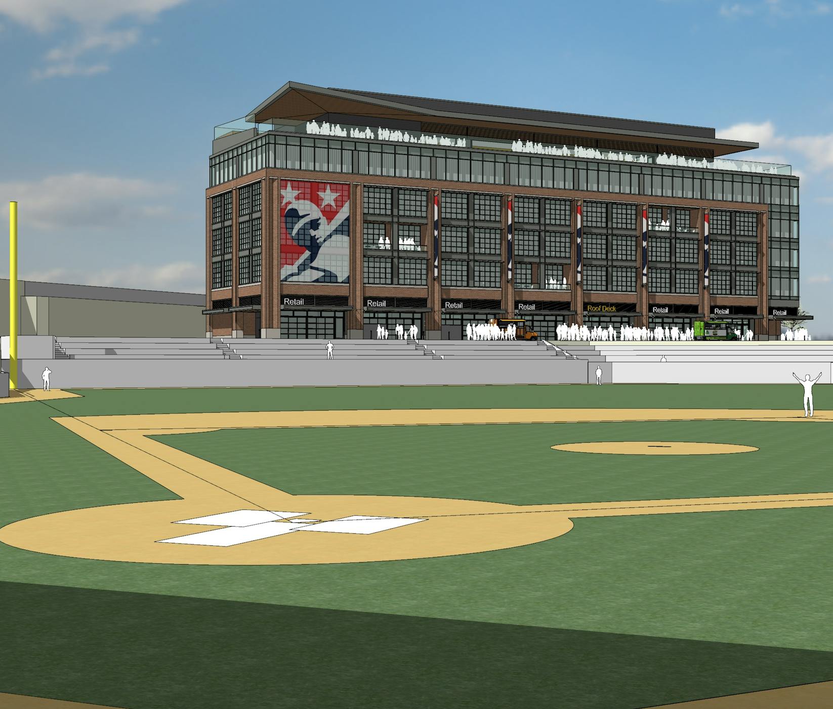 The property will sit above an underground parking garage and include a roof deck and retail space overlooking the playing field.