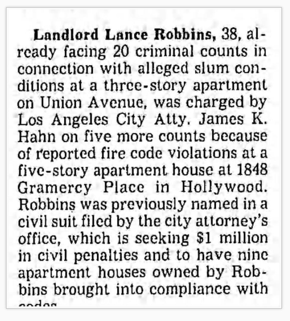 Los Angeles Times, August 8, 1986, "Landlord Issues 5 More Violations"