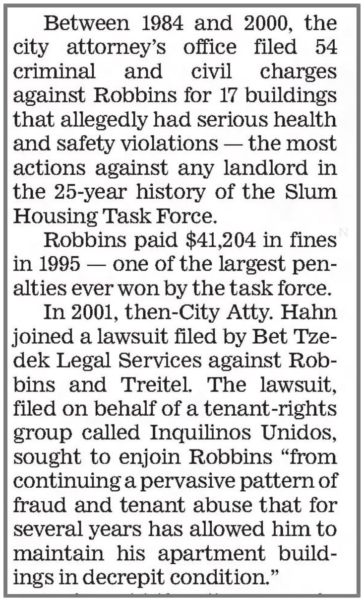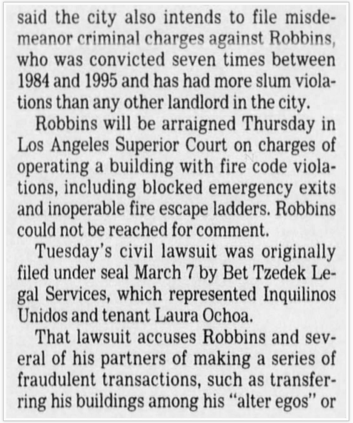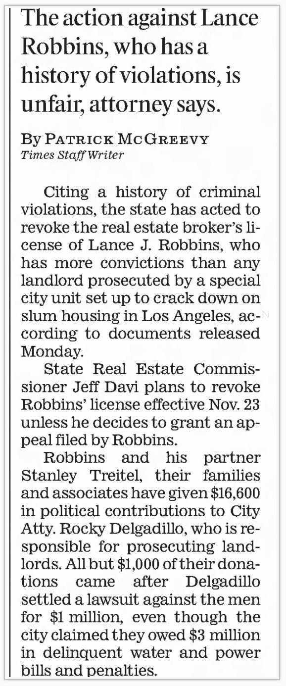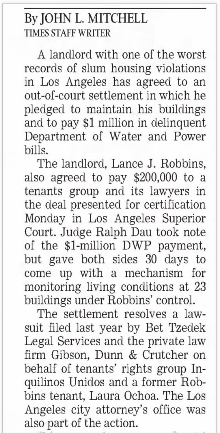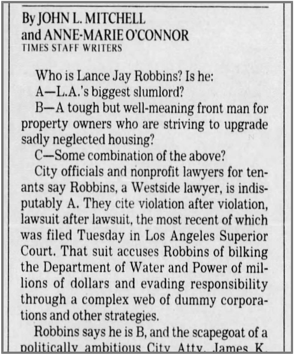 Lance Robbins was the worst slumlord in L.A. history. The city's Slum Housing Task Force prosecuted him numerous times for horrible conditions at his buildings. He also ran up huge water bills at his buildings that he refused to pay, and the city was reluctant to shut off the water for fear of harming the tenants. I filed a False Claims Act case against him and he was forced to pay $1 million in back water bills.