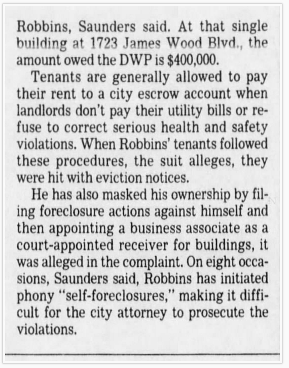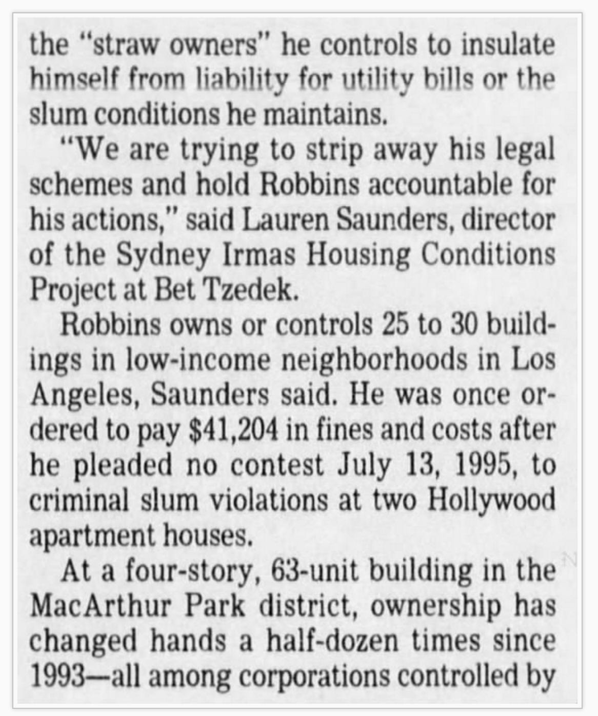 He was also extremely ingenious about using a complex web of sham corporations to avoid liability. After the fines from his slum violations and his back water bills started adding up, he started foreclosing against himself and putting his buildings into receivership to escape accountability. His buildings were in numerous different corporations and partnerships and he put loans in other names against his own buildings, then started a foreclosure action. He then asked the court to appoint a "neutral" receiver who he chose who actually just let Robbins stay in control of the building. We detailed that in the same lawsuit.