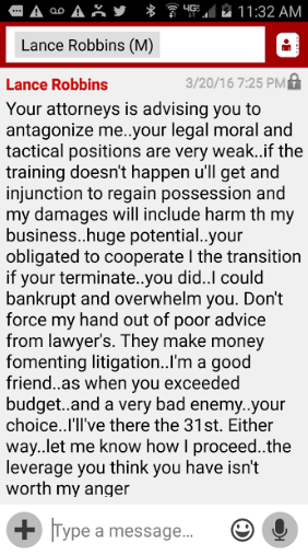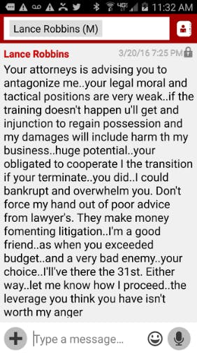 Text message sent to the owner of BlazeRI Small businesses call into question Robbins' business practices