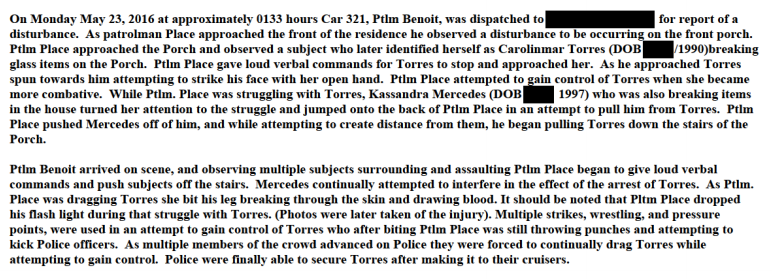 The police report states that the woman was "biting, throwing punches, and attempting to kick police officers."