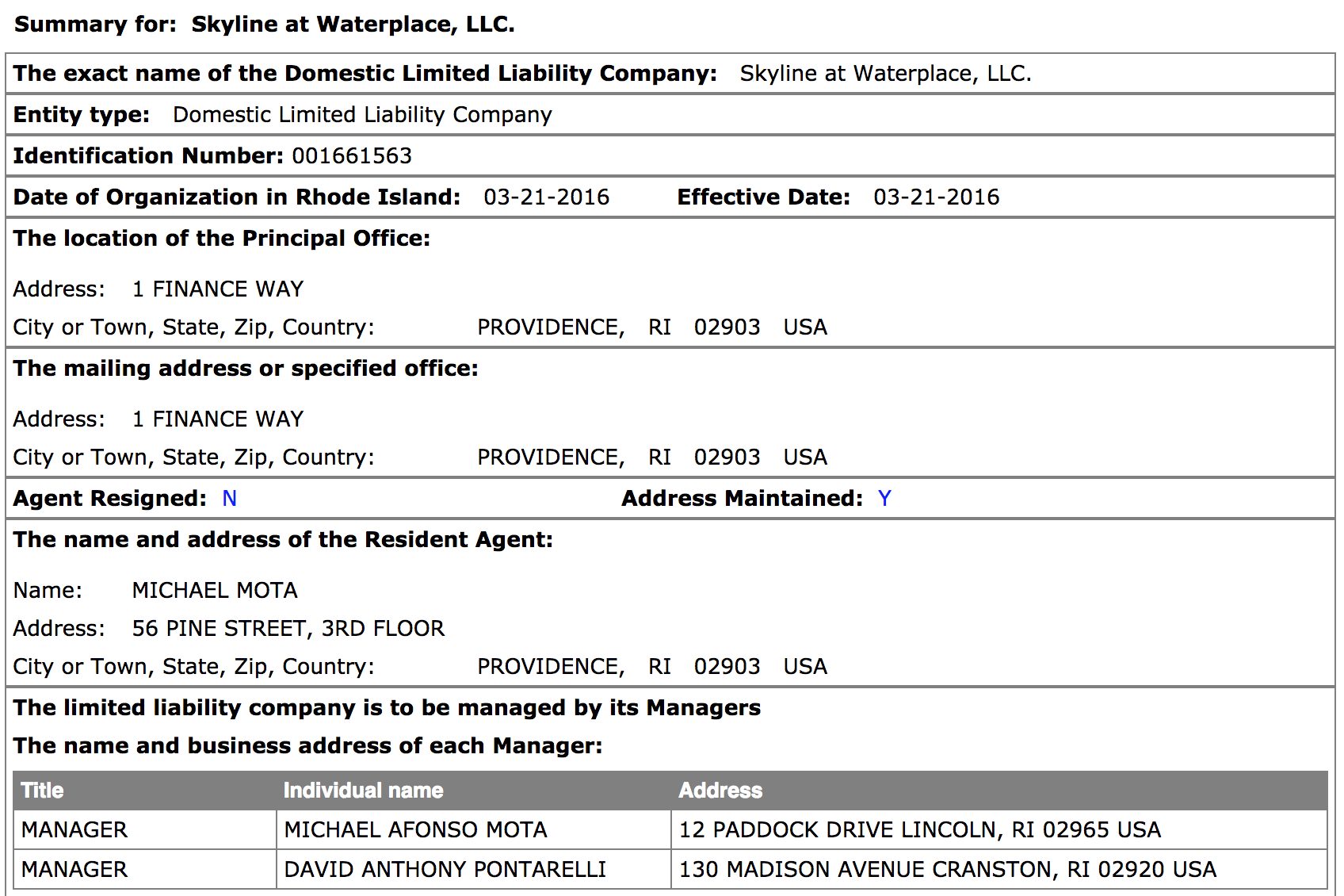 According to Rhode Island's corporation database Mota and Pontarelli are the two managers of Skyline at Waterplace, LLC