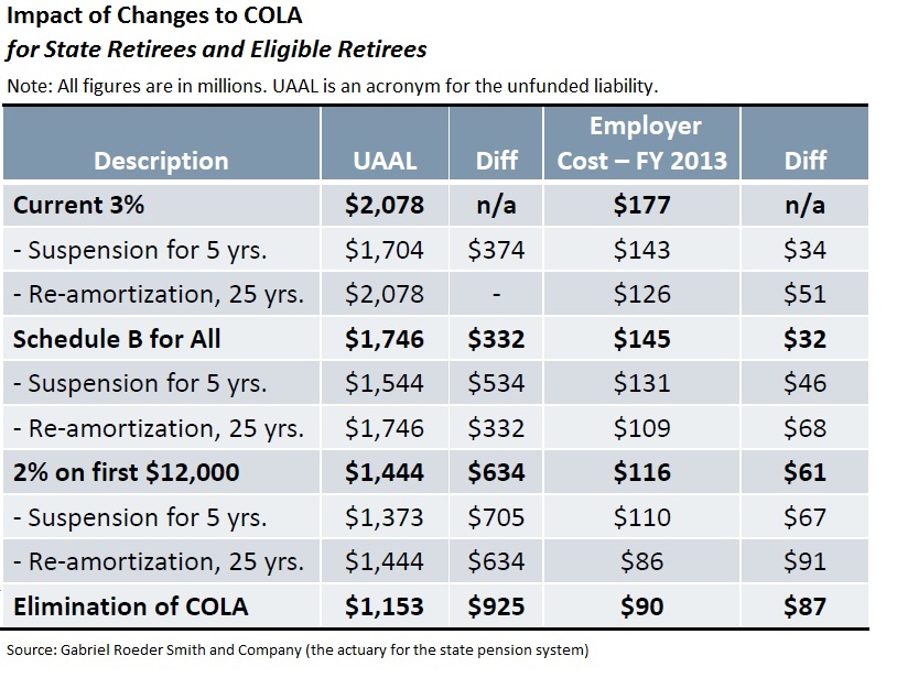 He said that could happen in one of two ways: either as an outright freeze on all COLAs for current retirees or by reducing the COLA to 3 percent on the first $35,000 of pension income—and basing that on the Consumer Price Index, a measure of inflation.