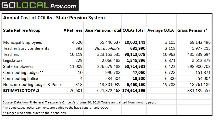 In all, the total tab for COLAs payments issued to roughly 26,600 retired state workers, municipal employees, teachers, and other retirees cost the state at least $174.6 million in 2010, based on a GoLocalProv review of pension payroll data.