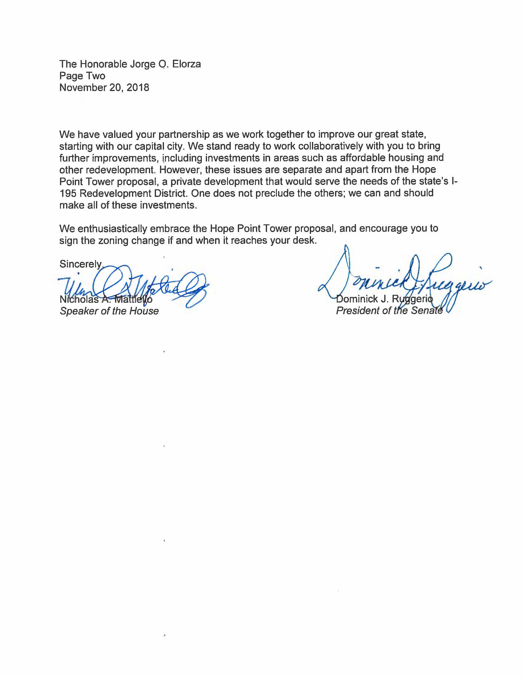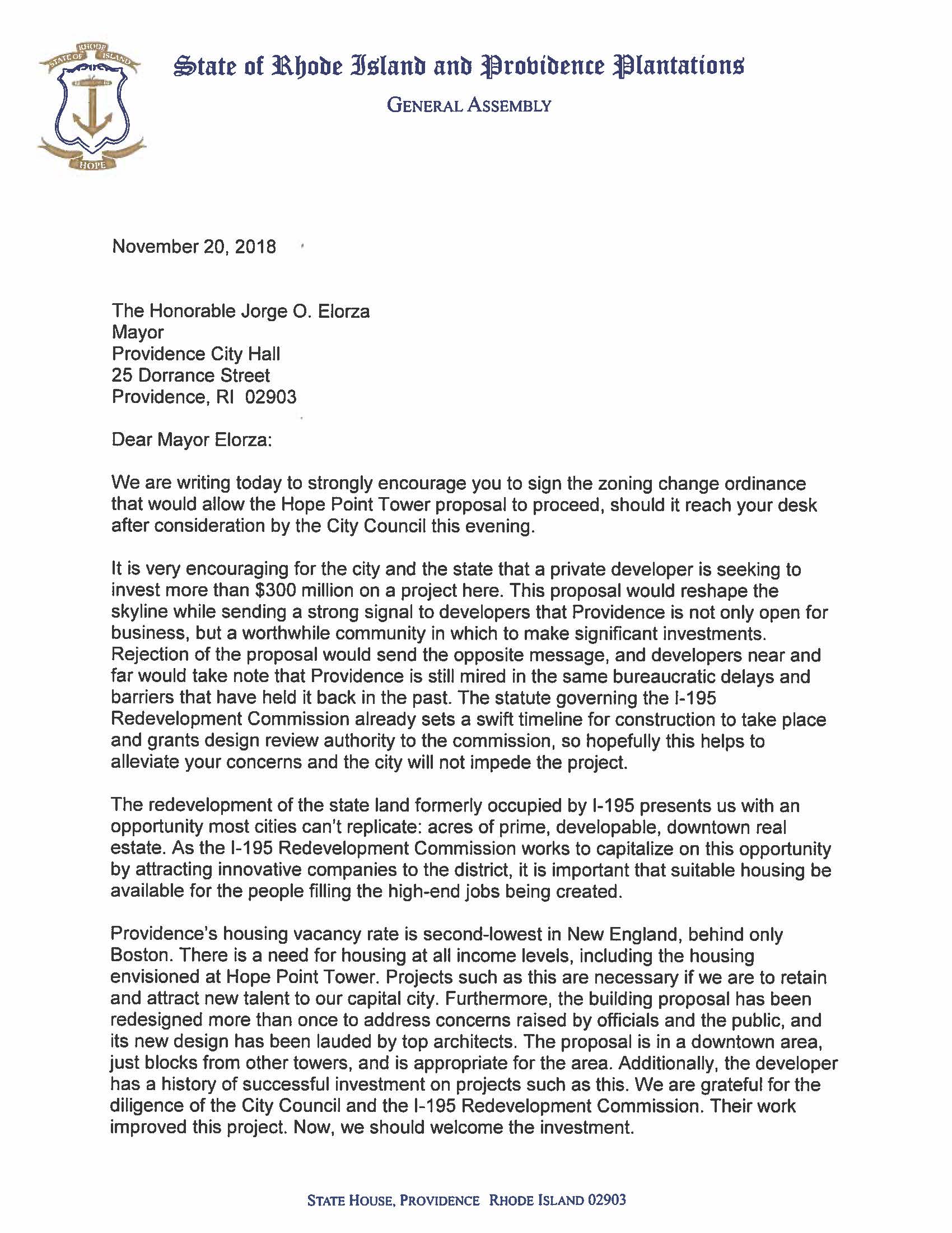 On Tuesday afternoon, Senate President Dominick Ruggerio and House Speaker Nicholas Mattiello sent a letter to Providence Mayor Jorge Elorza urging him not to veto the council action.