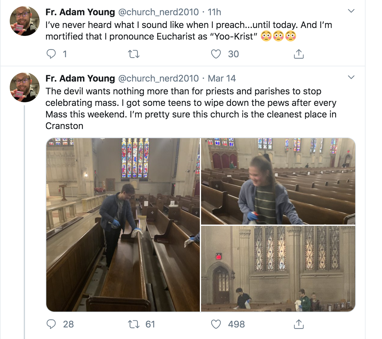 “The devil wants nothing more than for priests and parishes to stop celebrating mass. I got some teens to wipe down the pews after every Mass this weekend,“ Tweeted Young. “I’m pretty sure this church is the cleanest place in Cranston.