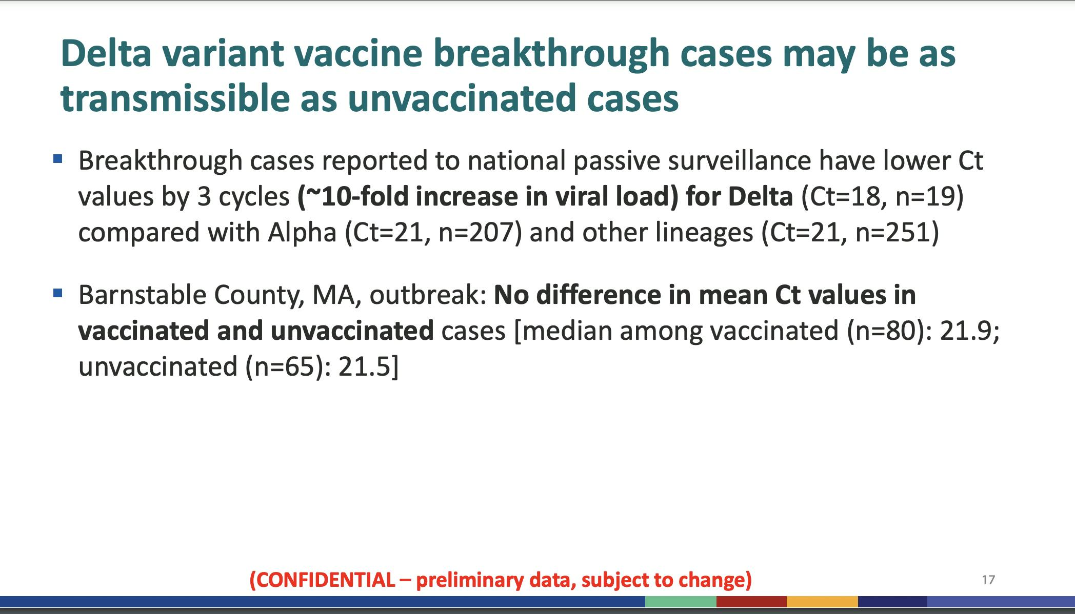These data are noted as preliminary and subject to change. However, if reaffirmed, these observations have significant impacts on the future of the pandemic and what must be done to successfully combat it. If vaccinated and unvaccinated individuals carry similar viral loads and are comparably contagious, then the current vaccines alone will not be able to end the crisis or allow life to return to normal. The CDC presentation acknowledges this and calls for additional, non-vaccine measures.