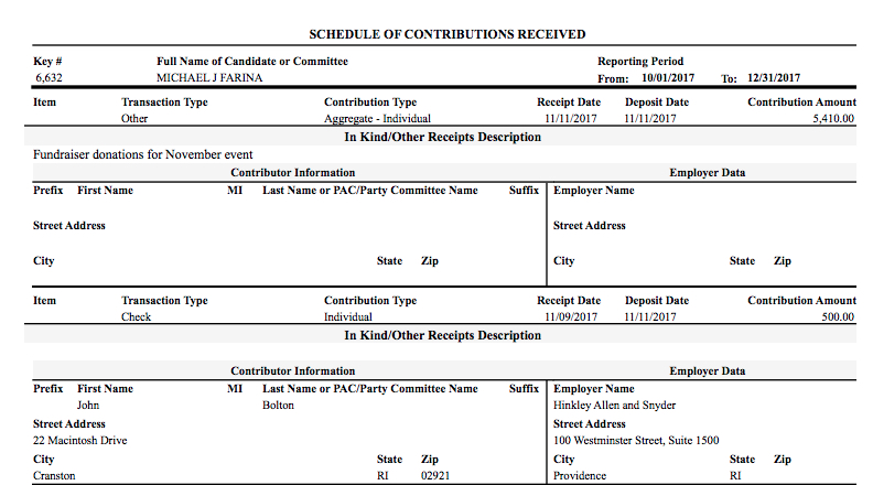 “No mystery just entered incorrectly. I have spoken with the BOE about the error, based on their suggestions I am going to review all the data from my November fundraiser before I amend the report. I had 157 people and almost as many checks so it will take a few days,” said Farina in an email to GoLocalProv. Farina refused to provide details.