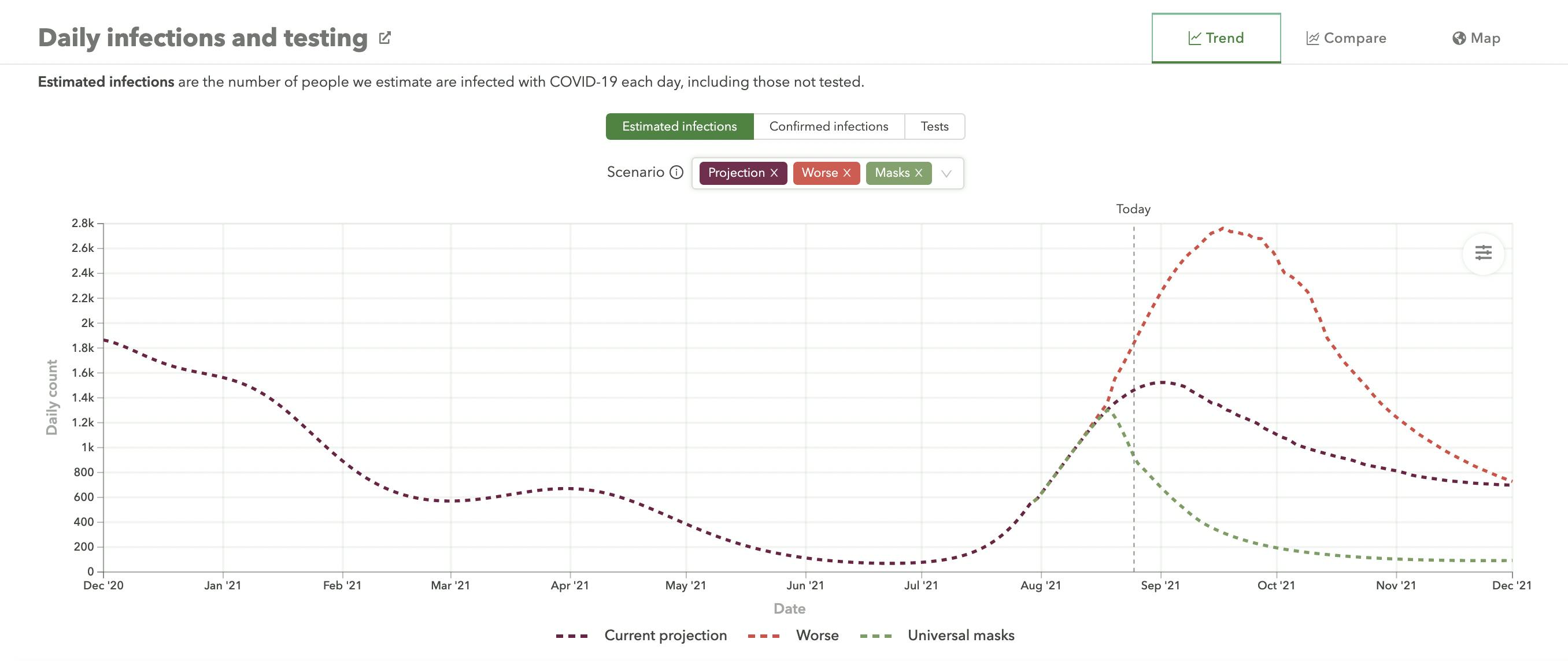 The Institute for Health Metrics and Evaluation (IHME) is an independent global health research center at the University of Washington. They have developed a mathematical forecasting model to project COVID infections, deaths, and hospitalizations. They have recently updated their forecast models to include the impacts of mask-wearing.