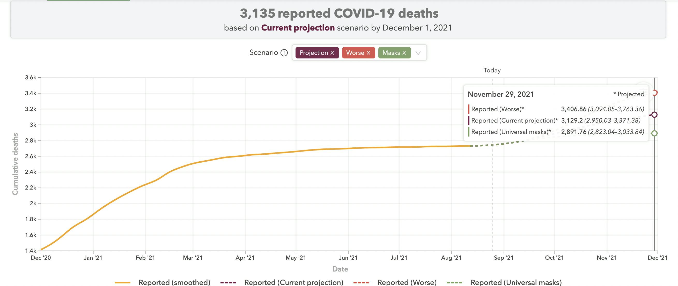 In Rhode Island, between now and December 1 they predict that over 200 lives could be saved (3,315 vs 2,893 deaths) with universal mask-wearing, and up to 500 lives if a worst-case scenario of COVID infections were to happen (3,415 vs 2,893 deaths).