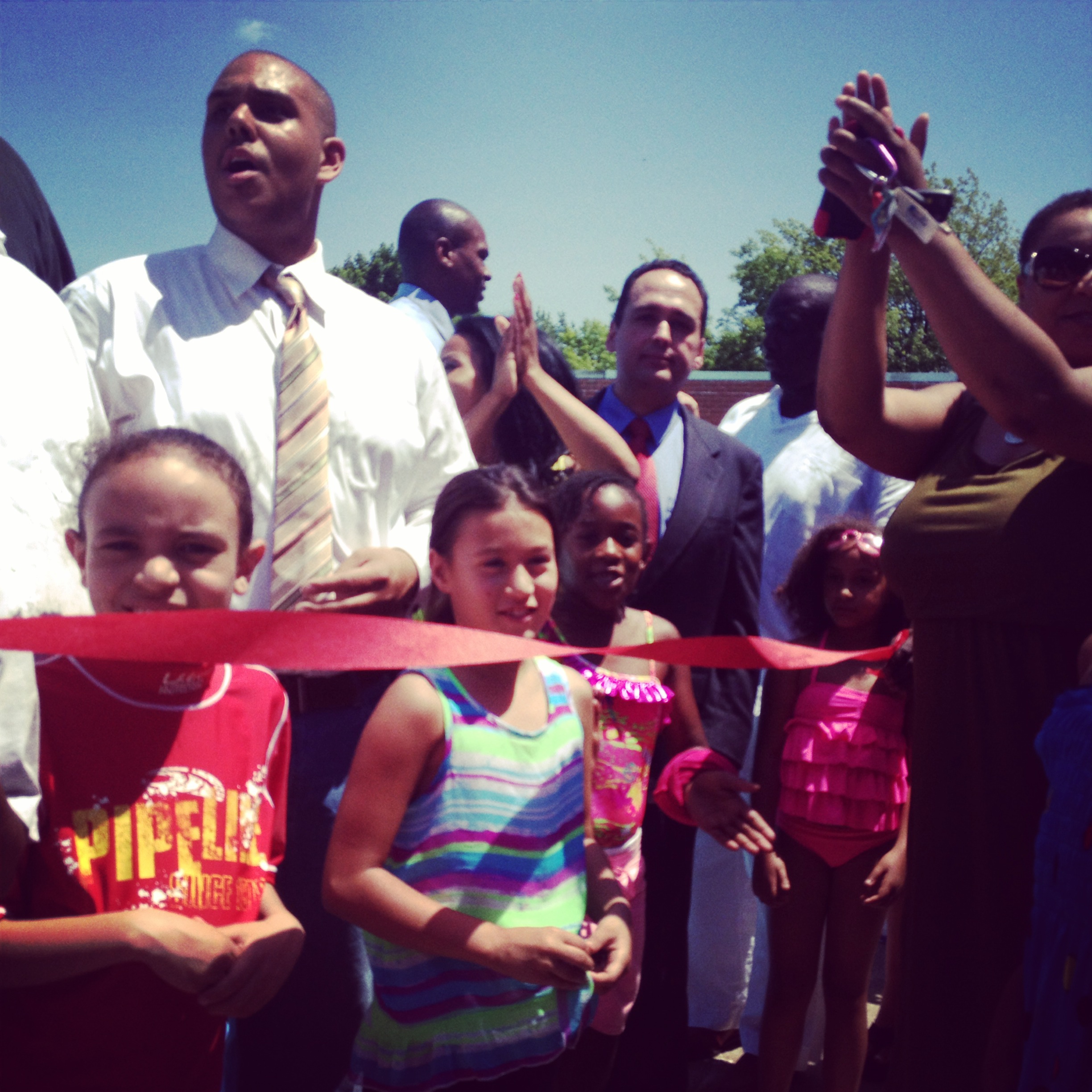 City Councilman Davian Sanchez, community activist Leah Williams Metts, General Treasurer Gina Raimondo, Providence Chief of Police Hugh Clements, City Council President Michael Solomon, and City Council members Luis Aponte, Michael Correia, Kevin Jackson, Sabina Matos, and Nick Narducci were among those who welcomed the crowd, and helped cut the ribbon to open the pool to swimmers.