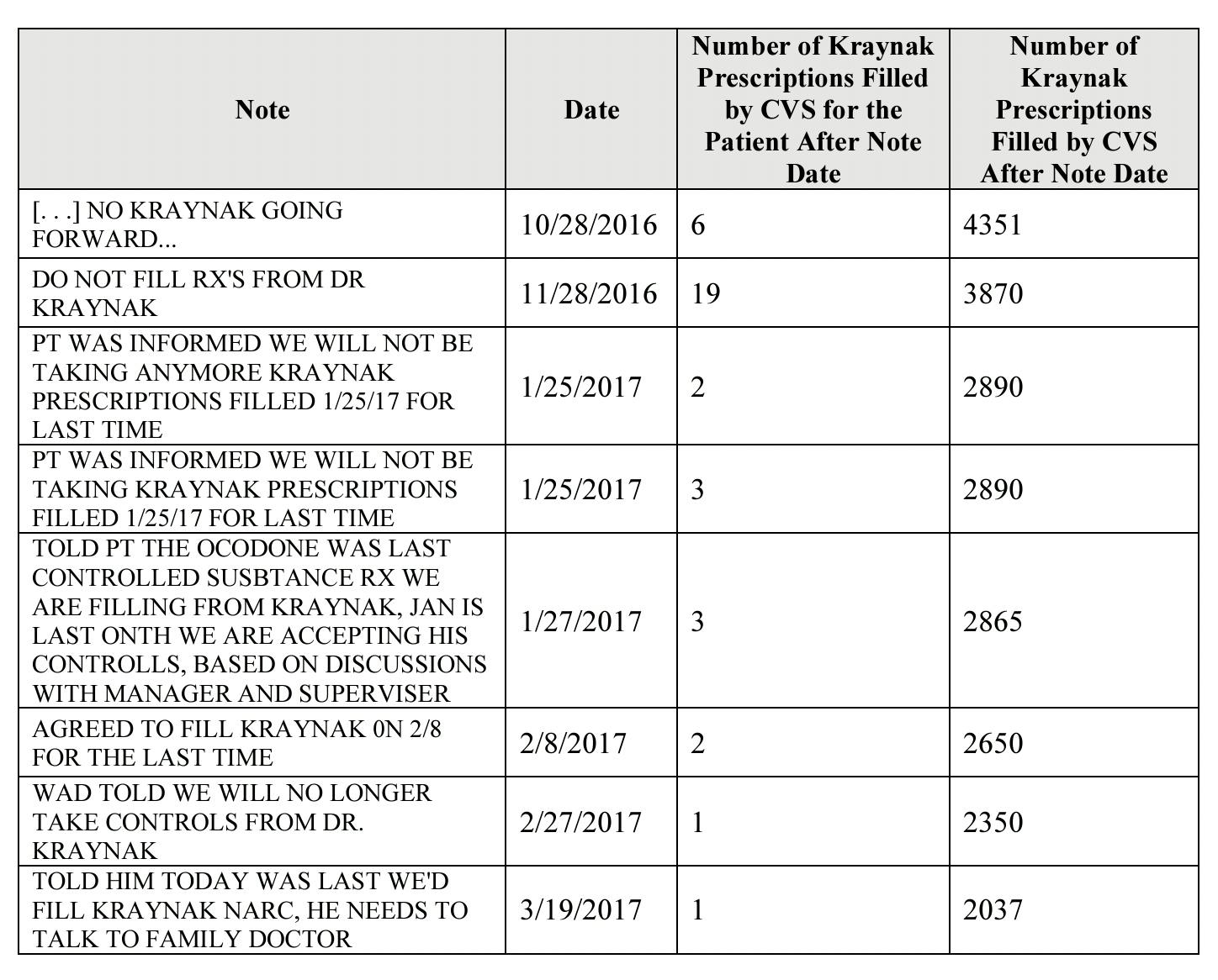 On or about May 31, 2016, a CVS pharmacist reported that Kraynak “is a prescriber of concern” who “often writes prescriptions for frequencies above what is recommended and only has office hours daily from 6am9am.”