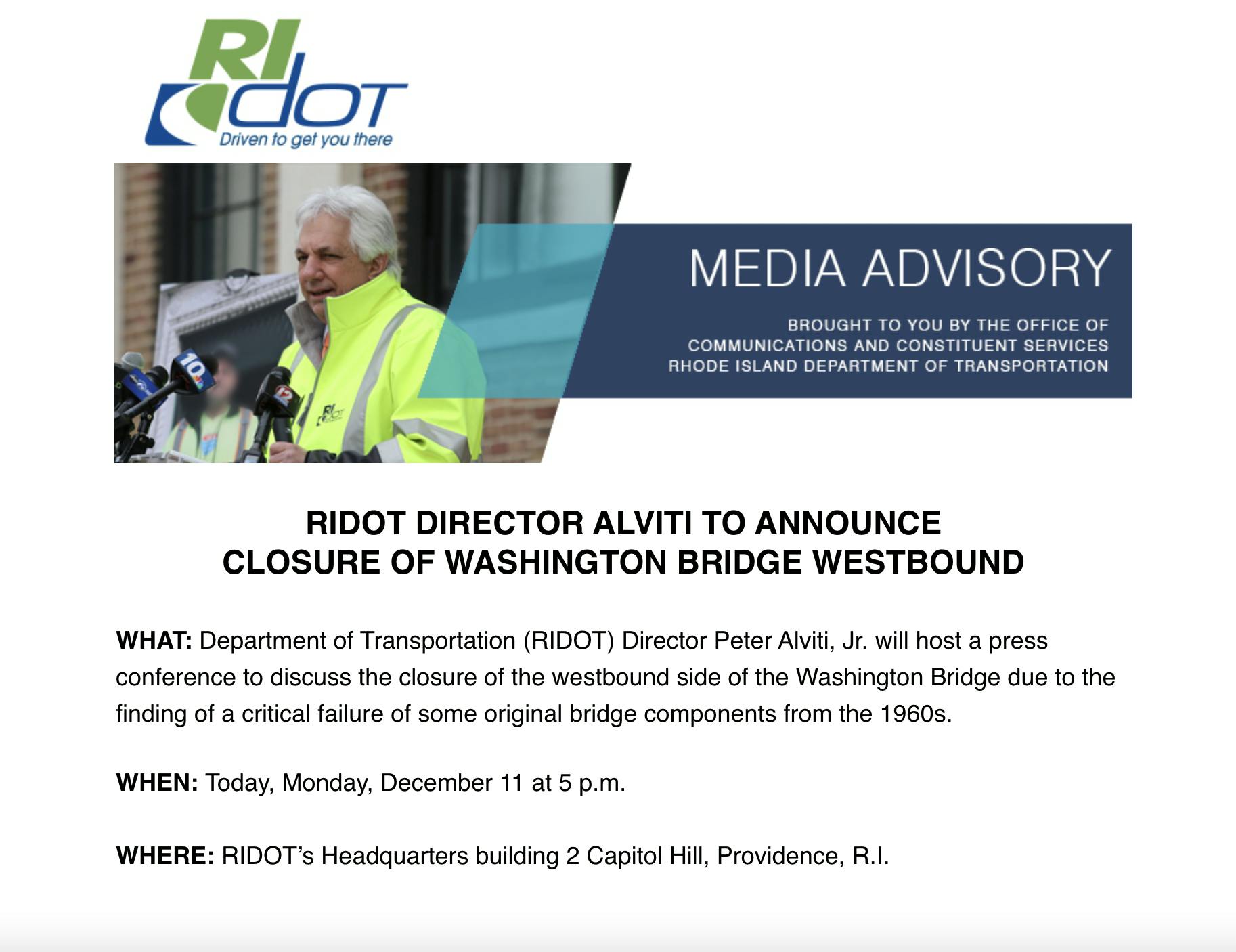 WHAT: Department of Transportation (RIDOT) Director Peter Alviti, Jr. will host a press conference to discuss the closure of the westbound side of the Washington Bridge due to the finding of a critical failure of some original bridge components from the 1960s.