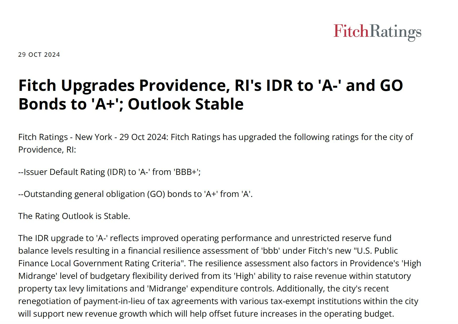 Fitch Issues Rating Report on the City of Providence