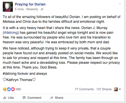 To all of the amazing followers of beautiful Dorian. I am posting on behalf of Melissa and Chris due to the families difficult and emotional night.