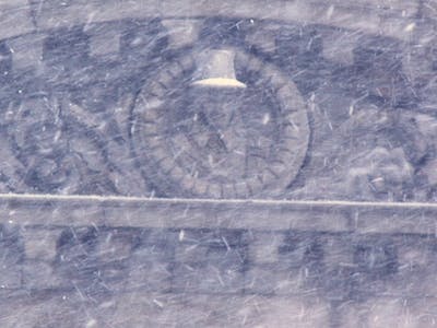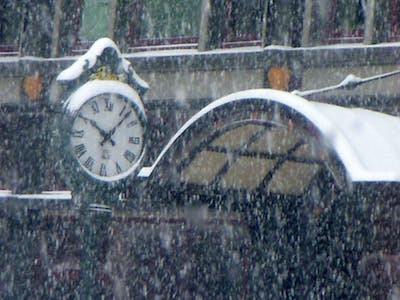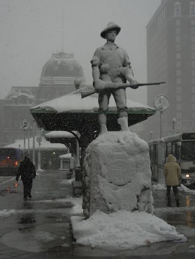 This is a super clock, and not just because of the Roman numerals that remind us of the Patriots’ Super Bowl victory. The clock has been a favorite meeting place for Rhode Islanders for years, including the doctor, and blizzard conditions make it no less enticing. Note that the crest atop the clock has a crest of its own.