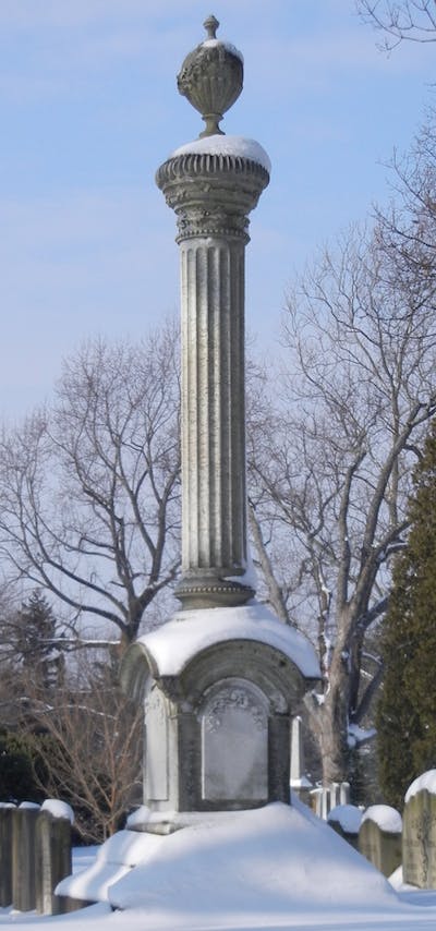 O to have one’s life memorialized with an ornament whose vitality plays a trick, turning winter’s assault of snow into an augmentation of beauty. The living should stroll the cemetery after a sudden storm, when even the most humble grave wears a dainty white cap. Life in death, quoth the doctor, is all we can hope for, yes?