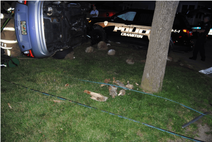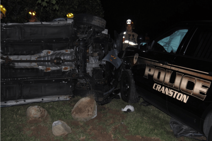 “The Officer attempted to stop to avoid the collision but did not have sufficient time to brake, causing him to strike Ruzzo’s vehicle broadside. The impact pushed Ruzzo’s vehicle sideways, before hitting a grass berm and causing the vehicle to flip onto its side. Both vehicles came to rest in the yard of a nearby residence located at 184 Wayland Avenue,” reported Cranston Police.