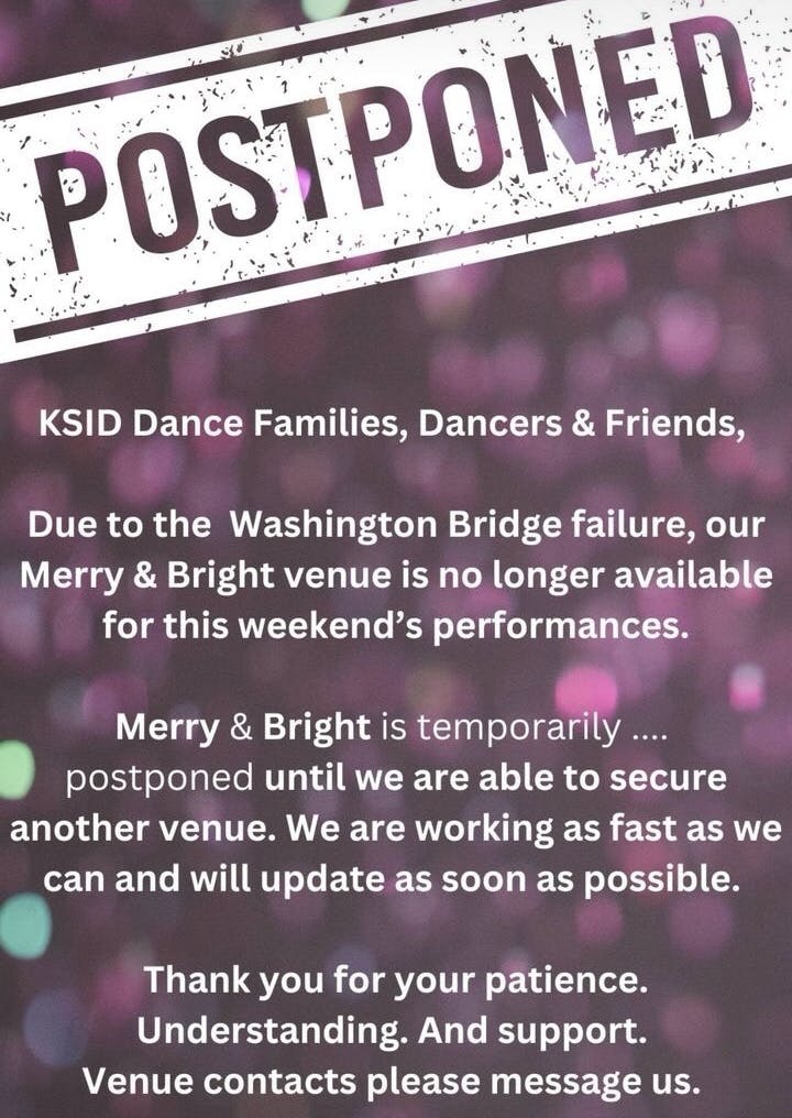 The Brain Injury Association of Rhode Island announced, “Unfortunately, we will be canceling our Holiday Party due to the unexpected closure of the Washington Bridge connecting East Providence and Providence.”