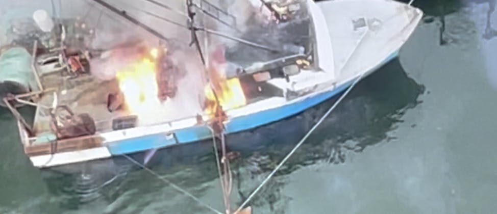 Photos provided to GoLocal show a fishing boat docked at Point Judith engulfed in flames.