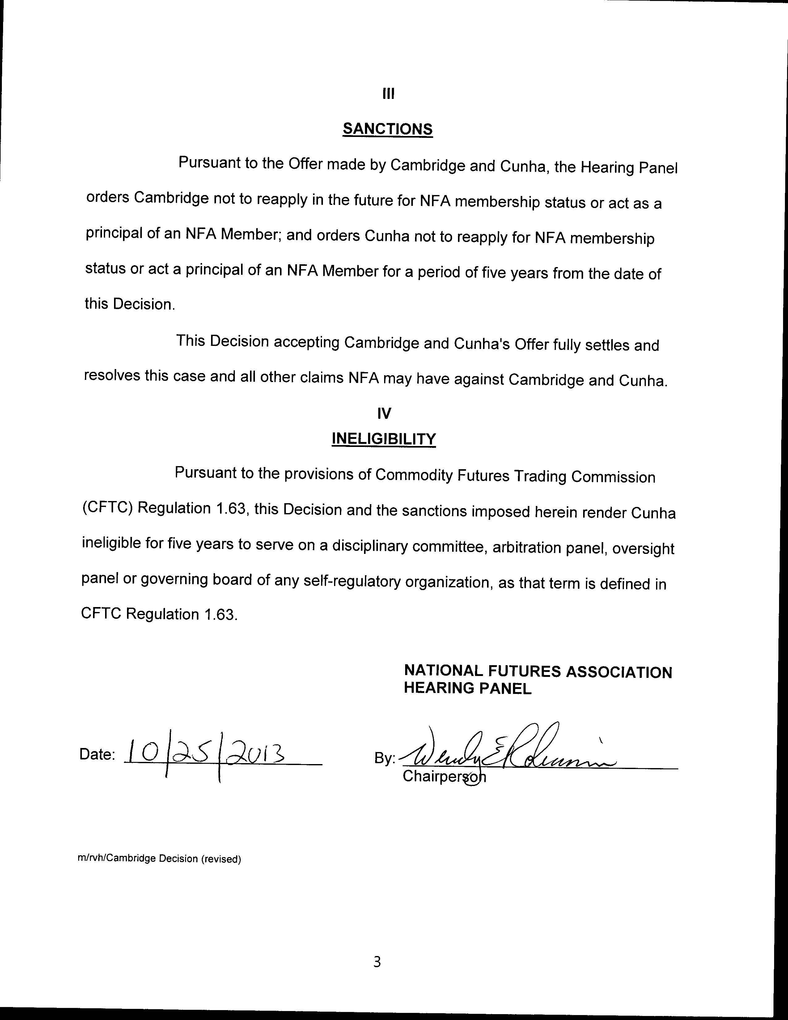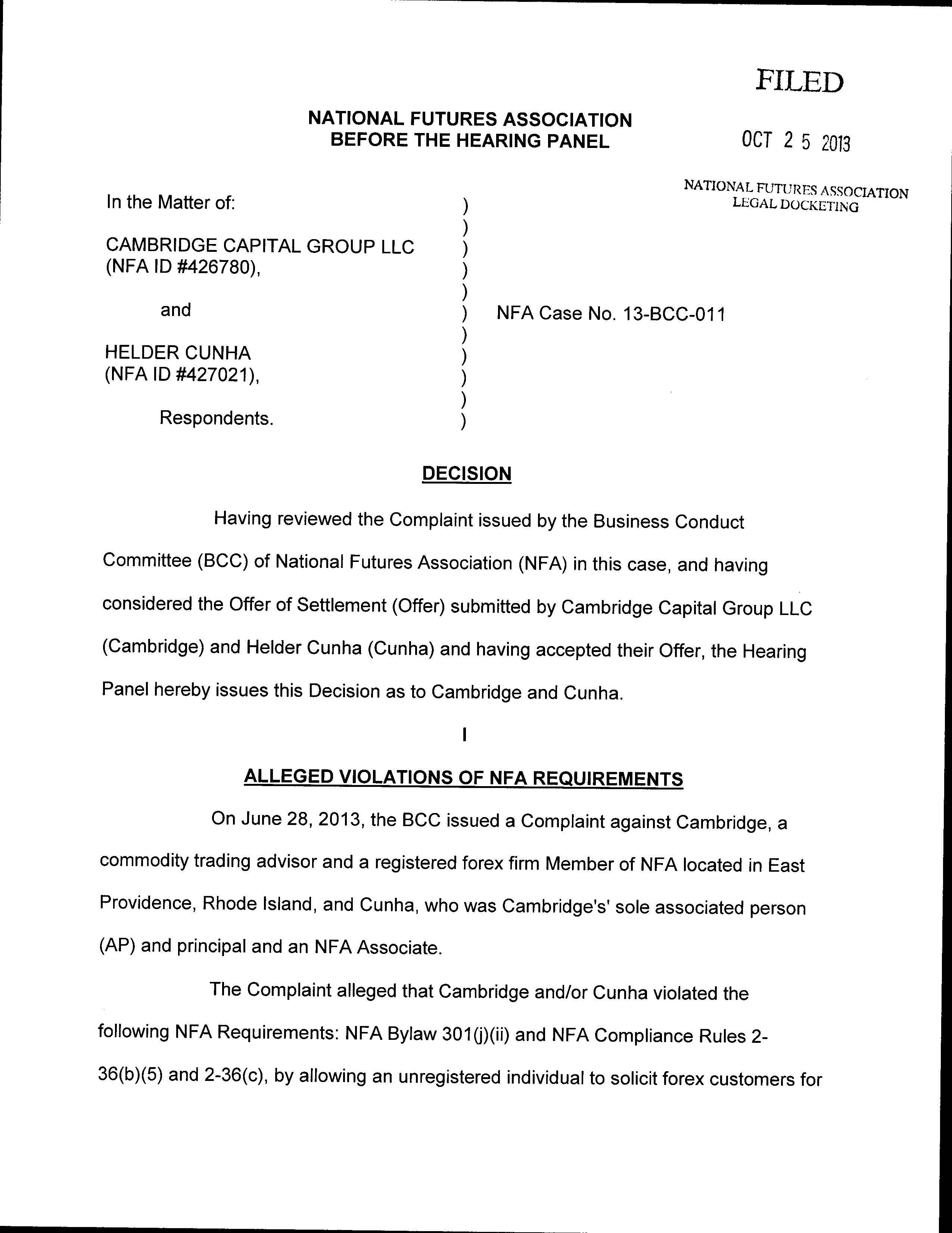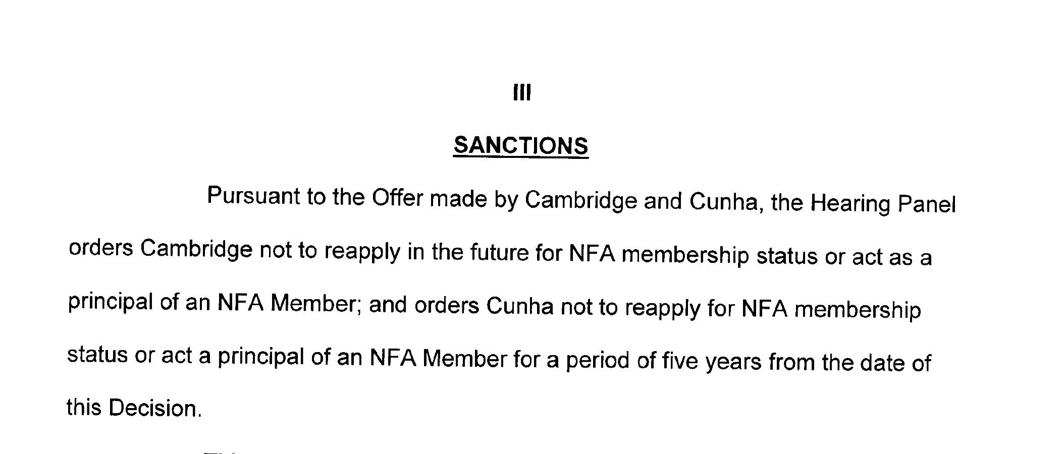After multiple complaints against Cunha and his company Cambridge Capital Group, the NFA disciplinary council “ordered Cunha not to reapply for NFA membership status or act a principal of an NFA Member for a period of five years from the date of [the] decision" in 2013.