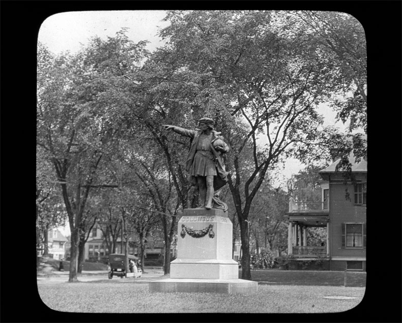 Columbus on Elmwood PHOTO: Providence Public LibraryThe Providence-based bronze cast statue is a cast of the original sterling silver statue commissioned for the 1892 Columbian Exposition of the World's Fair held in Chicago, Illinois. “For the upcoming exposition, Gorham wanted a demonstration piece to show the skill of its foundry and commissioned Bartholdi to create a statue of Columbus,” states the Rhode Island Secretary of State’s Office.