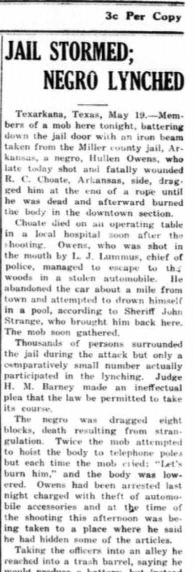 On May 22, 1922, Hullen Owens, a Black man, was lynched by a large white mob made up of thousands of people. It was not the only lynching down there in Texarkana. It simply made national news because the crowd was so big.