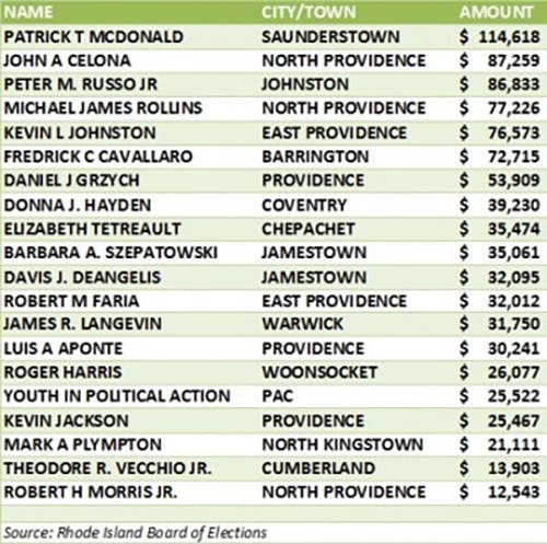 Currently, the five Rhode Islanders who owe the most to the state are former State Senate candidate Patrick T. McDonald ($114,618), former State Senator John Celona ($87,259), Peter M. Russo ($86,833), Michael James Rollins ($77,226) and Kevin L. Johnston ($76,573). Celona served over two years in federal prison for his role in the 2005 Operation Dollar Bill corruption investigation.