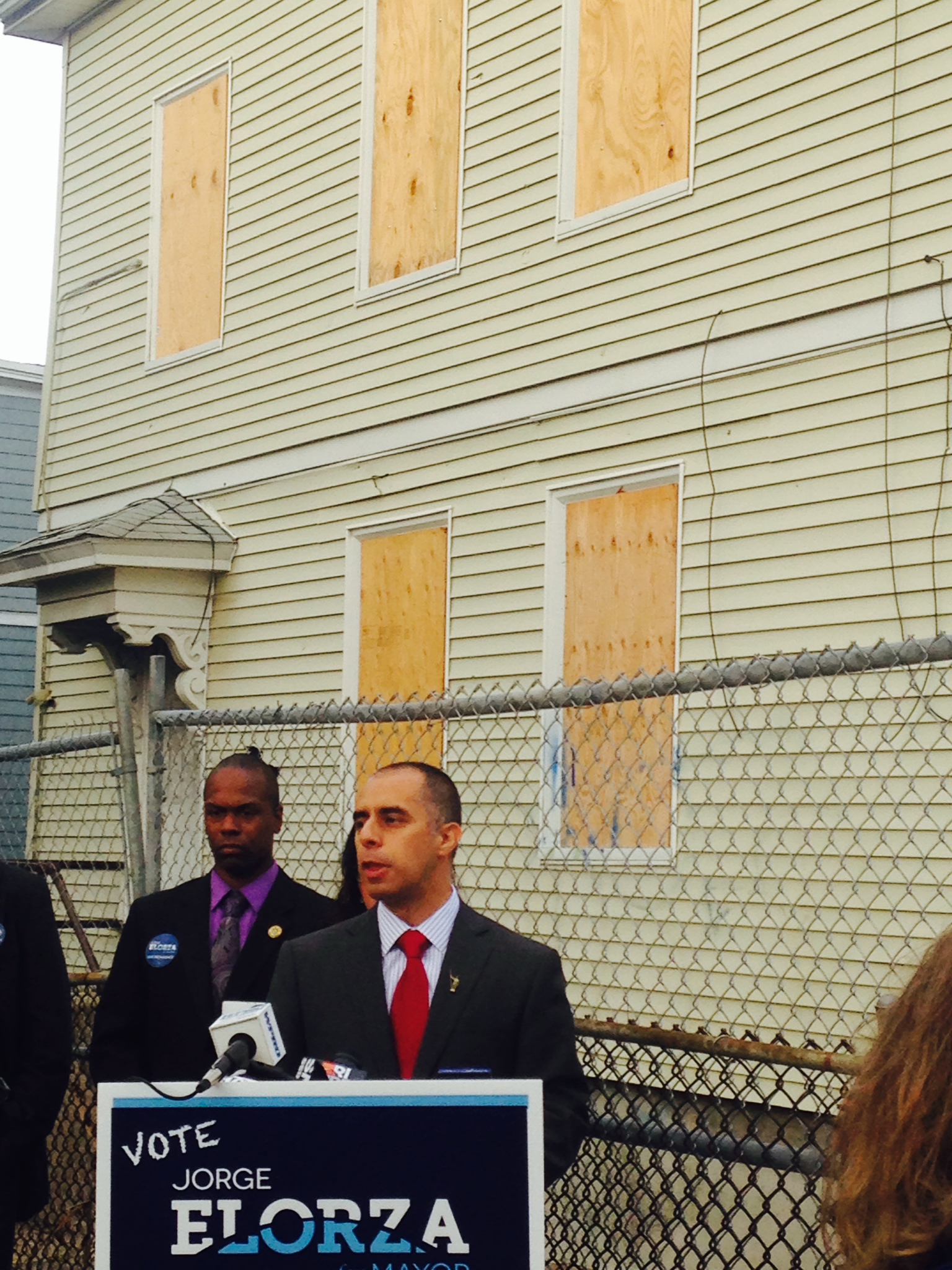 Standing in front of a backdrop of vacant and boarded up homes on Providence's North End, Democratic candidate for Mayor of Providence Jorge Elorza introduced his plan to address Providence's problem of vacant properties and create new affordable, safe and healthy homes in the city.